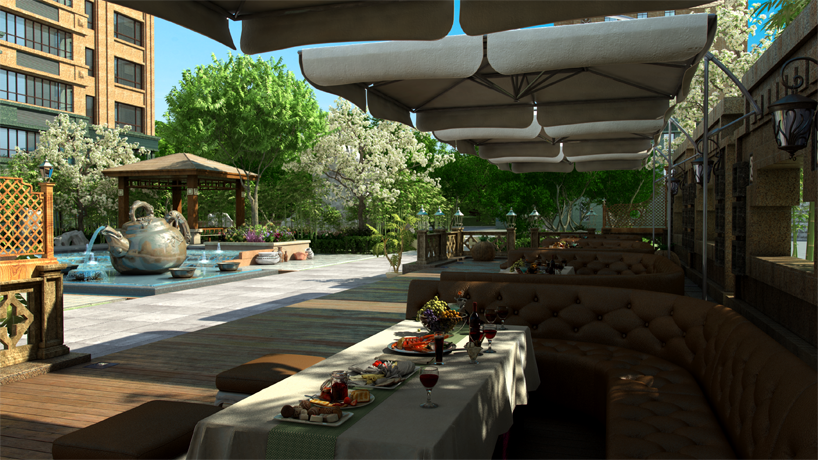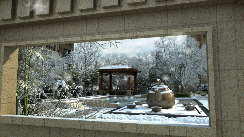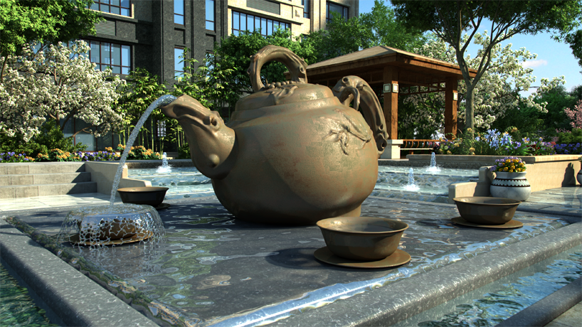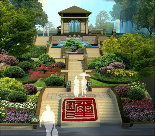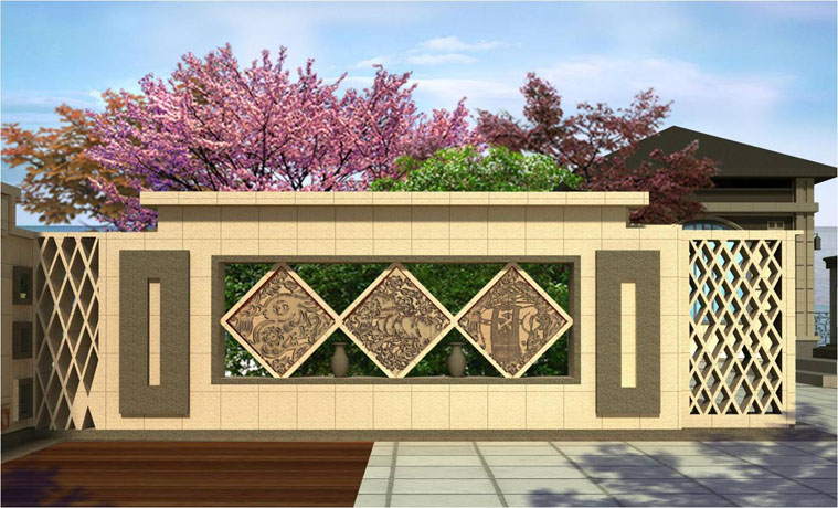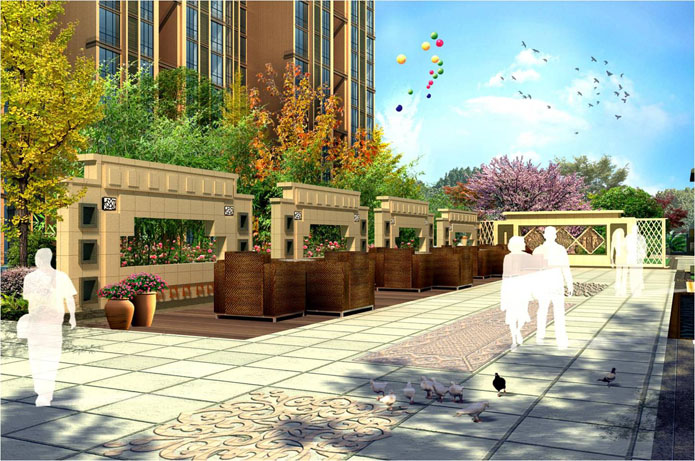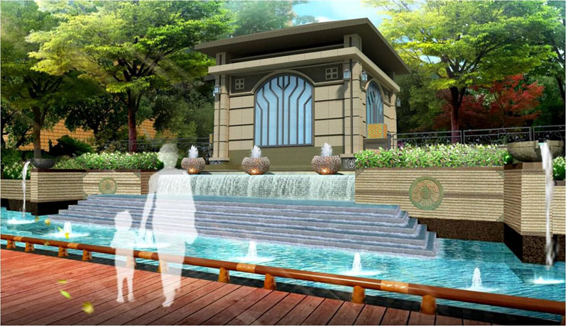 小區(qū)入口臺(tái)地形式恰有五層平臺(tái),通過前面裝飾與地面浮雕每層臺(tái)地分別為福、祿、壽、喜、財(cái)為主題,為小區(qū)業(yè)主招財(cái)納福。